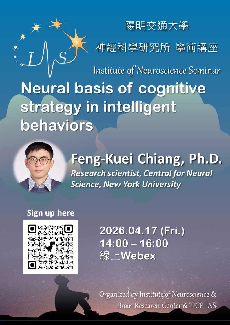 【NEUROSCIENCE SEMINAR】4/17 (Fri.) 14:00 Feng-Kuei Chiang, Ph.D. :Neural basis of cognitive strategy in intelligent behaviors.Academic 04/11/2026/by 宜嫺 林 https://ins.nycu.edu.tw/wp-content/uploads/2021/10/Header-LOGO.png 0 0 宜嫺 林 https://ins.nycu.edu.tw/wp-content/uploads/2021/10/Header-LOGO.png 宜嫺 林2026-04-11 08:09:402026-04-11 08:10:15【NEUROSCIENCE SEMINAR】4/17 (Fri.) 14:00 Feng-Kuei Chiang, Ph.D. :Neural basis of cognitive strategy in intelligent behaviors.